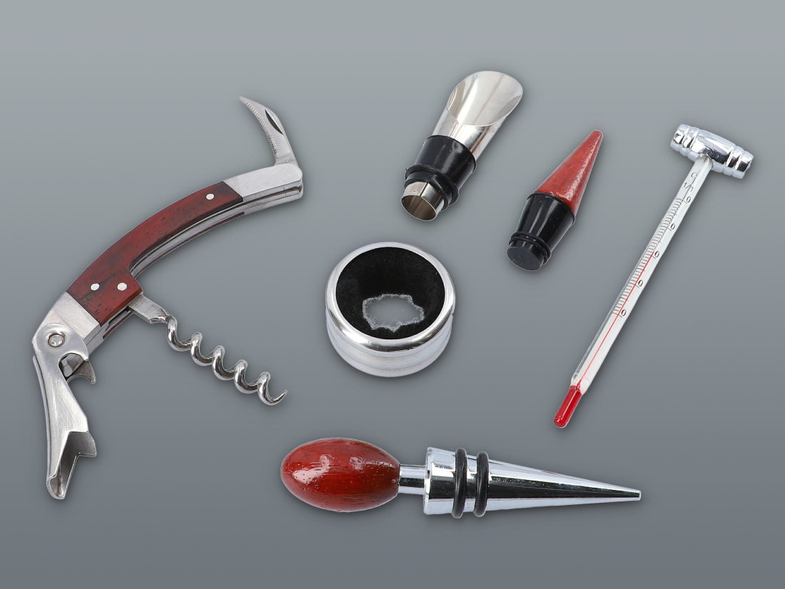 Setul este ambalat într-o cutie frumoasă de culoarea lemnului de cireș, care conține: